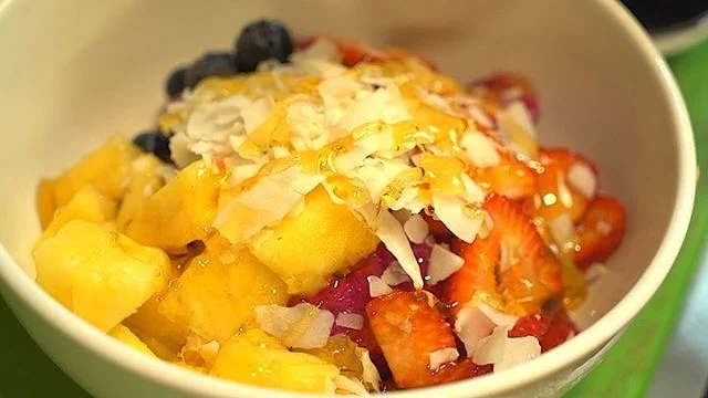 Low-fat Greek yogurt mixed with fresh strawberries, blueberries & granola.
